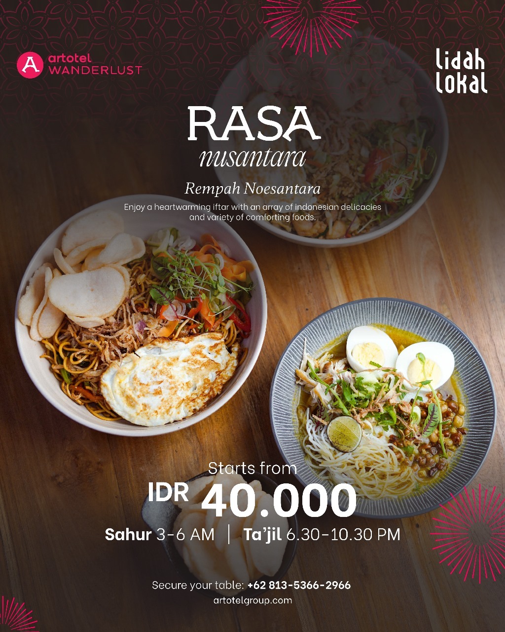 Untuk program F&B, ARTOTEL Sanur – Bali sudah menyiapkan pilihan sajian sahur dan takjil untuk berbuka puasa yang dapat dinikmati di Lidah Lokal Sanur Restoran, yaitu Rempah Noesantara dimulai dengan harga Rp 40,000,– dengan menu pilihan antara lain Nasi Goreng Ayam, Mie Goreng Ayam, dan Bubur Ayam. Sedangkan untuk takjil berbuka puasa tersedia Es Daluman, Mangga Ketan Hitam, Es Timun Markisa, dan Thai Aromatic Tea.