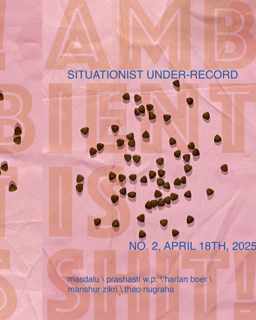 AMBIENT IS SHIT!, a “4-way” split sound album featuring contributions from Bottlesmoker, Nissal Berlindung, Theo Nugraha and Manshur Zikri, is now available on Bandcamp. In this album, we include a special bonus: a digital zine Situationist Under-Record Edition 2. Those who contributed to this zine are Prashasti W. Putri @prashastiwp, Dalu Kusma @masdalu, and Harlan Boer @harlan_boer. You’ll get the zine for free if you purchase the album!