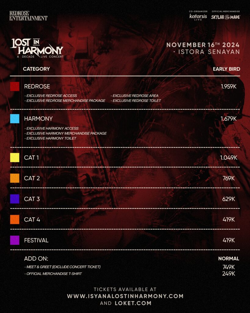 Para penggemar pun sudah dapat membeli tiket early bird sejak hari rabu malam (12/6) melalui situs www.isyanalostinharmony.com atau loket.com. Ada berbagai kategori tiket yang dapat dipilih untuk menikmati konser spektakuler ini. Dimulai dari area festival yang dibanderol dengan harga Rp419.000. Area tribun juga dibuka untuk penonton dengan harga terendah di kategori CAT 4 seharga Rp419.000. Kategori selanjutnya yakni CAT 3 dibanderol dengan angka Rp629.000 dan tribun CAT 2 seharga Rp769.000 hingga yang tertinggi yakni CAT 1 berada di angka Rp1.049.000.