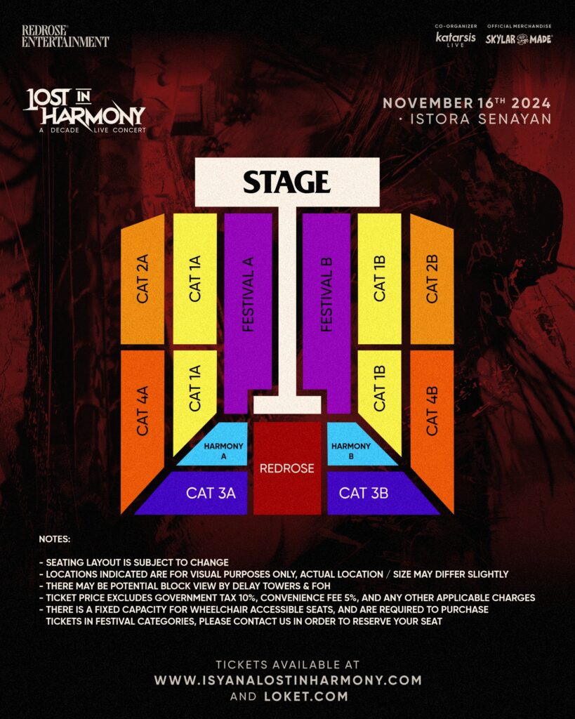 Isyana Sarasvati juga menawarkan dua kelas spesial bernama HARMONY dan REDROSE. Untuk kelas spesial HARMONY, pengunjung akan mendapatkan area menonton spesial di tribun, cinderamata spesial, dan akses serta toilet khusus. Sedangkan untuk pemegang tiket kelas REDROSE, penggemar akan mendapatkan area menonton yang paling strategis dan ideal untuk menikmati keseluruhan show treatment baik secara audio maupun visual, di mana seperti yang kita ketahui, Isyana dan team selalu menyiapkan kreasi serta pengalaman konser yang tak terlupakan. Kini saatnya mengalami secara langsung penampilan spesial dari Isyana Sarasvati dengan menyelami perjalanan karier satu dekadenya yang monumental.