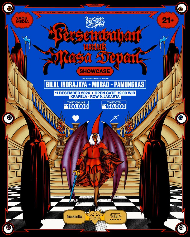 Romantic Echoes, atau yang dikenal sebagai alter ego dari musisi J. Alfredo, akan menggelar showcase perdana untuk merayakan perilisan album terbarunya, “Persembahan untuk Masa Depan.” Sembari merayakan perilisan album “Persembahan untuk Masa Depan,” showcase ini juga menjadi penanda penting bagi Romantic Echoes yang sudah berkarir selama empat tahun di industri musik dengan berbagai diskografi yang telah dibagikan. Showcase ini diberi tajuk “Persembahan Untuk Masa Depan Showcase” yang akan diselenggarakan pada tanggal 11 Desember 2024 di Krapela Live, Jakarta Selatan.