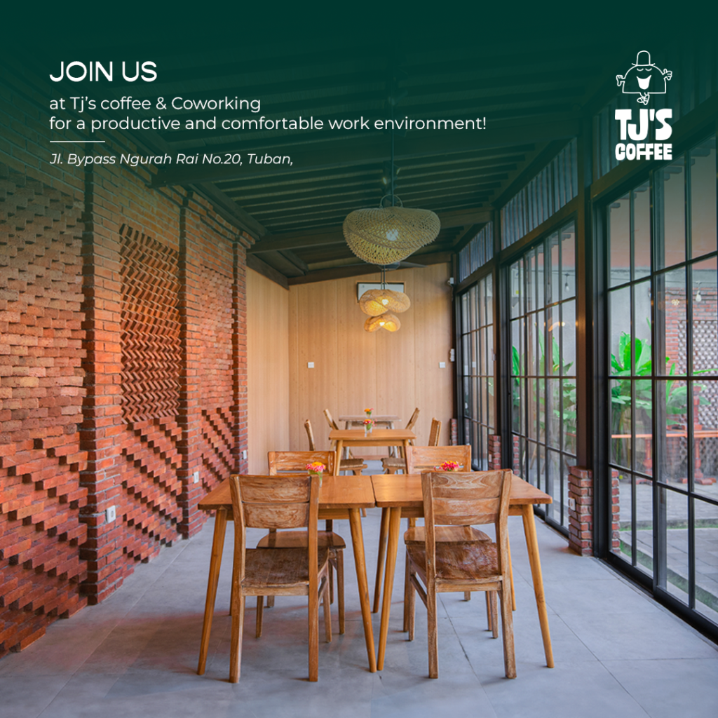 TJ’S Coffee & Co-Working by TRM Hospitality adalah sebuah tempat yang memadukan kafe dengan ruang kerja bersama atau co-woking space, berjalan dibawah naungan dari management TRM Hospitality, TJ’S Coffee & Co-Working Mengusung konsep “Work & Relax”. Tempat ini dirancang untuk menciptakan lingkungan yang nyaman dan inspiratif, ideal untuk bekerja, bersosialisasi, dan berkolaborasi. TJ’S Coffee and Co-Working tarletak di Jl. Bypass Ngurah Rai No.20, Tuban, Kec. Kuta, Bali, 80361, Dan buka di setiap hari (Senin hingga Minggu) mulai