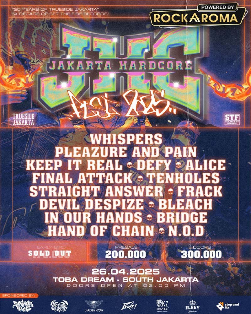 JHC Fest ’25 akan dimeriahkan oleh deretan band lokal yang sedang ada di puncak performa mereka, sebut saja: Defy, Final Attack, Devil Despize, Alice, Straight Answer, Frack, Ten Holes, Pleazure and Pain, dan masih banyak lagi. Tak hanya itu, penampilan spesial dari band asal Thailand dan rilisan Flatspot Records, yaitu Whispers, dipastikan bakal jadi puncak ledakan malam itu. Dengan tiket yang sudah sold out bahkan sebelum hari-H, dan tanpa tiket on the spot, bisa dibayangkan betapa padat dan gilanya suasana nanti. Stage dive, two-step, sing-along, dan mosh pit yang brutal, semua akan menyatu dalam satu malam penuh energi. Kami berharap semua yang hadir bisa bersenang-senang, saling jaga, dan bawa pulang semangat yang sama: This is more than just music, it’s community. Sampai jumpa di pit.